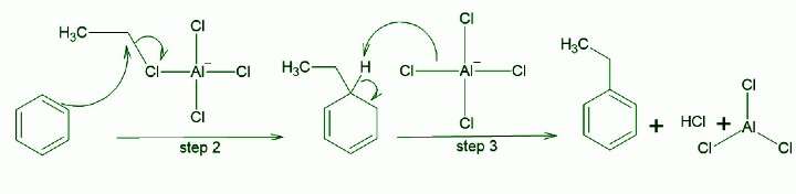 步驟 3 - 中間體的去質子化導致 C-C 雙鍵重建,分子恢復其芳香性。AlCl3 催化劑在該質子轉移至形成 HCl 時得到再生。