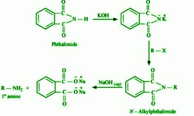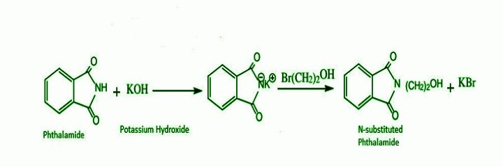 Gabriel合成是一種製備伯胺的寶貴方法。在這個過程中,首先用鄰苯二甲酸酐與氨水製備鄰苯二甲醯亞胺,然後使鄰苯二甲醯亞胺與烷基化試劑反應,形成鄰苯二甲醯亞胺的偶極共振形式。羰基增加了氮氫鍵 (𝑁 − 𝐻) 的酸性。帶負電的氮原子取代了滷代烷中的鹵素。它會發生水解反應生成N-烷基鄰苯二甲醯亞胺,然後進一步水解生成伯烷基胺和鄰苯二甲醯亞胺鈉鹽或鉀鹽。這是一個親核反應。