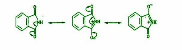 鄰苯二甲醯亞胺具有與兩個羰基相連的氮,它們以一種使其略微酸性的方式排列,並透過去除質子與鹼結合。羰基比羧基更穩定。它透過電荷離域形成幾種共振形式。