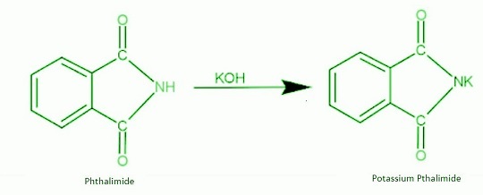 步驟1 - 在第一步中,鄰苯二甲醯亞胺受到氫氧化鉀或氫氧化鈉的攻擊,鄰苯二甲醯亞胺中的氮被去質子化形成鄰苯二甲醯亞胺鉀鹽。鄰苯二甲醯亞胺中的氮具有很強的親核性。