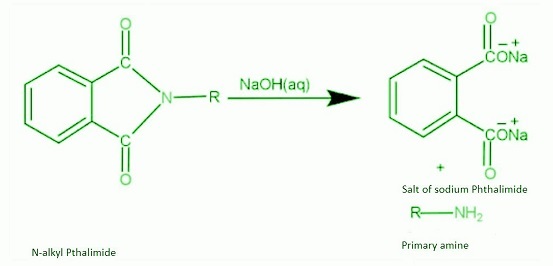步驟3 - 在第三步中,N-烷基鄰苯二甲醯亞胺受到氫氧化鉀或氫氧化鈉的攻擊,氮從鄰苯二甲醯亞胺上脫落,形成伯胺和鄰苯二甲醯亞胺鈉鹽或鉀鹽。氮脫落是因為它比鄰苯二甲醯亞胺基團中的氧更具電負性。