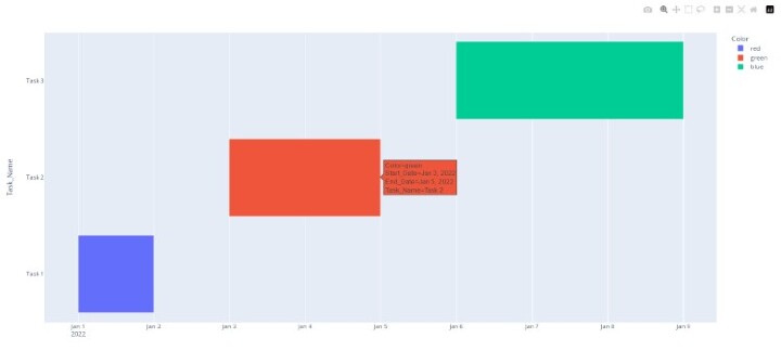 import plotly.express as px fig = px.timeline(df, x_start="Start_Date", x_end="End_Date", y="Task_Name") fig.show()