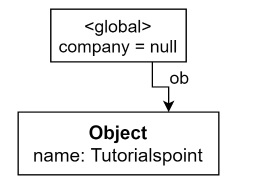 讓我們來看另一個示例,我們在這裡使用兩個引用。讓我們考慮以下程式碼,其中 company 物件由另一個名為 ob 的變數引用。