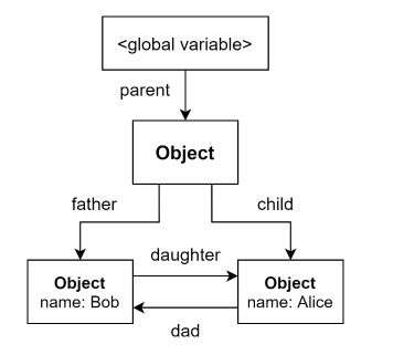 function parent(dad, daughter) { dad.daughter = daughter; daughter.dad = dad; return { father: dad, child: daughter } } let parent = parent({ name: "Bob" }, { name: "Alice" });