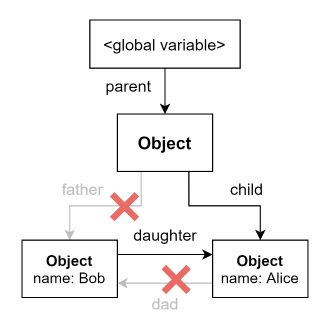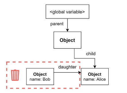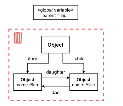 刪除這兩個連結後,father(Bob)沒有傳入連結。垃圾收集器將從記憶體中移除整個 father 物件。此想法在下圖中進行了描述。