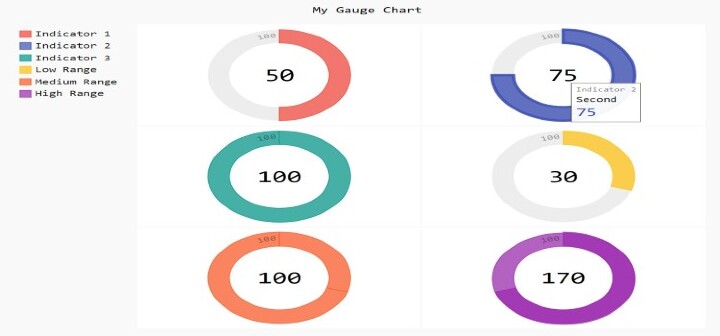 可以使用儀表盤圖表表示各種統計資料,例如完成率、朝著目標的進展和績效指標。對於顯示落在特定範圍內的資料(例如百分比或分數),它們非常有用。能夠快速輕鬆地突出顯示需要改進的領域,使它們成為顯示需要立即關注或採取行動的資料的有用工具。為了使資料更美觀易懂,您可以使用 Python 函式中傳遞的引數自定義它們,以設定各種顏色和設計。