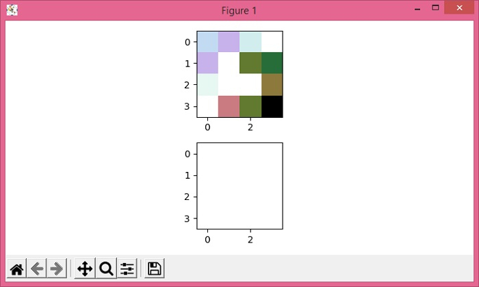 import numpy as np from matplotlib import pyplot as plt from scipy.ndimage import gaussian_filter plt.rcParams["figure.figsize"] = [7.00, 3.50] plt.rcParams["figure.autolayout"] = True fig, axes = plt.subplots(2) data = np.array([[1., 1.2, 0.89, np.nan], [1.2, np.nan, 1.89, 2.09], [.78, .67, np.nan, 1.78], [np.nan, 1.56, 1.89, 2.78]]) axes[0].imshow(data, cmap="cubehelix_r") gaussian_filter_data = gaussian_filter(data, sigma=1) axes[1].imshow(gaussian_filter_data, cmap="cubehelix_r") plt.show()
