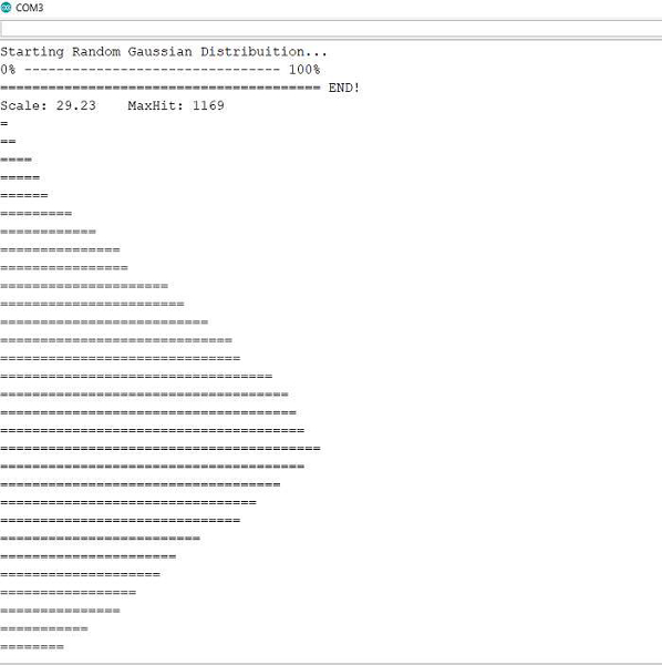 Serial.println(" 100%");接下來,執行到測試次數的 for 迴圈。for 迴圈的第一部分很簡單,只需在 0 ---- 100% 行下方列印 ======== 行。重要部分是後半部分。使用 **g1.random()** 生成高斯隨機數。根據其值,確定其位置(即它將位於哪個條形圖中)(**int place = (int)round(val - g1.mean + zero);**)。然後將位置限制在 0 和 36 之間,即小於 0 的條目將向上拉到 0,大於 36 的條目將向下推到 36。最後,該位置的 hits 陣列的值遞增,表示生成的隨機值最終分配給了該條形圖。