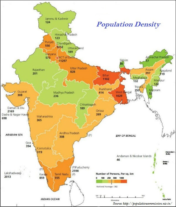 根據2011年人口普查,印度的人口密度為每平方公里**382人**。