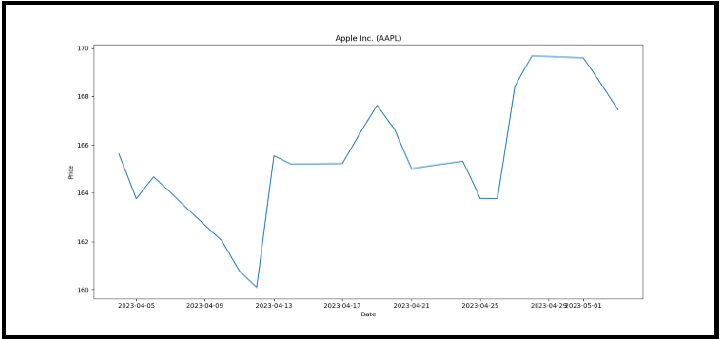 此程式碼使用Python中的yfinance庫來檢索特定股票程式碼(在本例中為“AAPL”,代表蘋果公司)的財務資料。然後,它列印有關股票程式碼的詳細資訊,檢索歷史OHLC(開盤價、最高價、最低價、收盤價)價格,並使用matplotlib庫繪製歷史價格。