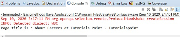 import org.openqa.selenium.By; import org.openqa.selenium.WebDriver; import org.openqa.selenium.WebElement; import org.openqa.selenium.chrome.ChromeDriver; import java.util.concurrent.TimeUnit; public class PageTitle{ public static void main(String[] args) { System.setProperty("webdriver.chrome.driver","C:\Users\ghs6kor\Desktop\Java\chromedriver.exe"); WebDriver driver = new ChromeDriver(); driver.manage().timeouts().implicitlyWait(5, TimeUnit.SECONDS); driver.get("https://tutorialspoint.tw/about/about_careers.htm"); // getTitle() to obtain page title System.out.println("Page title is : " + driver.getTitle()); driver.close(); } }