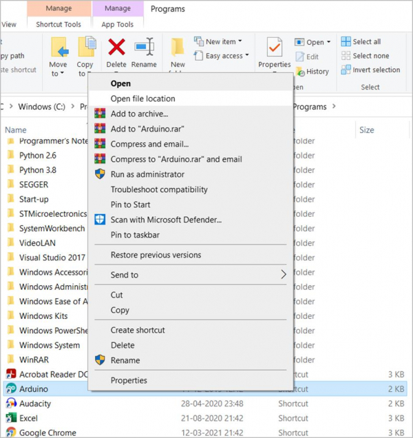 可以透過訪問包含Arduino軟體的目錄來訪問Arduino原始碼檔案。在Windows系統上,你可以在開始選單中輸入Arduino,右鍵單擊Arduino,然後點選“開啟檔案位置”。如果這開啟的是快捷方式圖示,你可以右鍵單擊快捷方式圖示,然後再次點選“開啟檔案位置”。