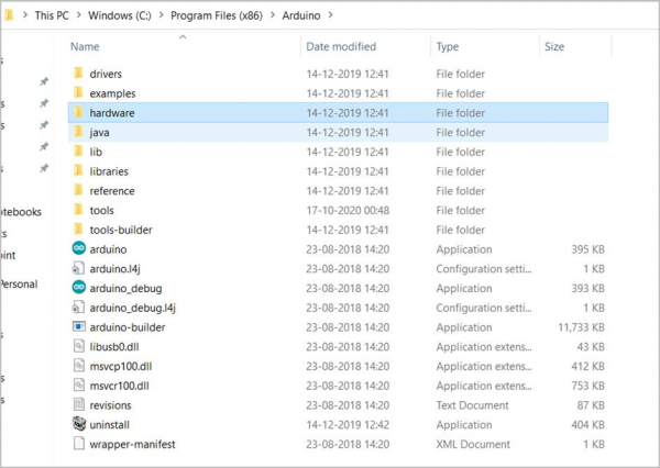 這將開啟包含Arduino軟體可執行檔案的資料夾。Windows系統上的路徑通常是**C:\Program Files (x86)\Arduino**。