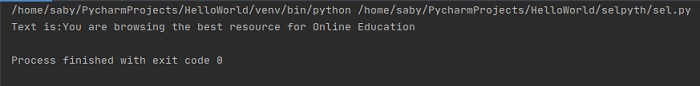 from selenium import webdriver driver = webdriver.Chrome (executable_path="C:\chromedriver.exe") # maximize with maximize_window() driver.maximize_window() driver.get("https://tutorialspoint.tw/index.htm") # identify element l=driver.find_element_by_css_selector("h4") # get text and print print("Text is: " + l.text) driver.close()