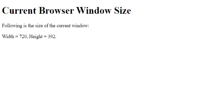 <!DOCTYPE html> <html> <body> <h1>Current Browser Window Size</h1> <p>Following is the size of the current window:</p> <p id="test"></p> <script> var wd = window.innerWidth; var ht = window.innerHeight; var x = document.getElementById("test"); x.innerHTML = "Width = " + wd + ", Height = " + ht + "."; </script> </body> </html>