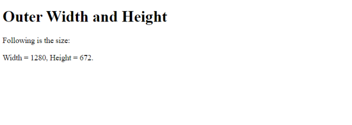 <!DOCTYPE html> <html> <body> <h1>Outer Width and Height</h1> <p>Following is the size:</p> <p id="test"></p> <script> var wd = window.outerWidth; var ht = window.outerHeight; var x = document.getElementById("test"); x.innerHTML = "Width = " + wd + ", Height = " + ht + "."; </script> </body> </html>