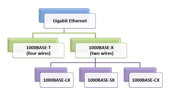 常見型別的快速乙太網有 1000Base-SX、1000Base-LX、1000BASE-T 和 1000Base-CX。