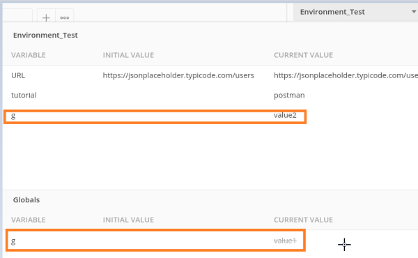 讓我們從“無環境”下拉列表中選擇另一個環境 - Environment_Test。然後再次單擊眼睛圖示。具有 value1 值的全域性變數 g 也應該適用於此環境。