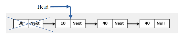 Input Linked list is: 30 10 40 40 After deleting first node of the linked list: 10 40 40