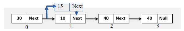 Input Linked list is: 30 10 40 40 Inserting new node at 1th index, Linked List is: 30 15 10 40 40