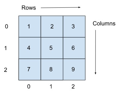 如果一個二維陣列有 'r' 行和 'c' 列,那麼陣列中的第一個元素儲存在 (0,0) 索引處,最後一個元素位於 (r−1,c−1) 索引處。