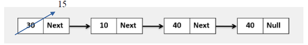 Input Linked list is: 30 10 40 40 Update node after 10th value node, Linked List is: 30 10 15 40