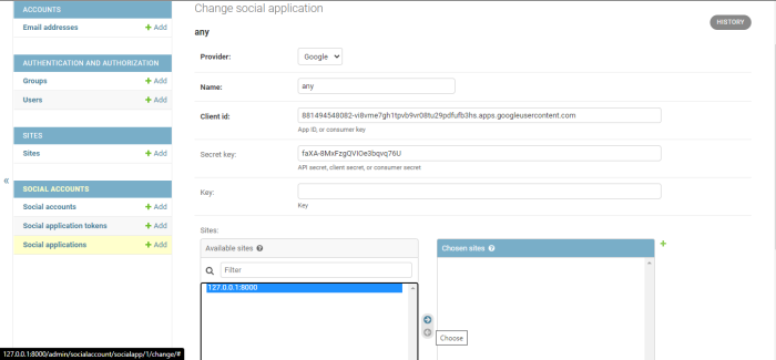 然後,啟動伺服器並轉到管理面板。轉到站點並新增一個具有 url 名稱和顯示名稱的站點:http://127.0.0.1:8000