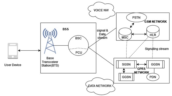 新增到現有GSM架構中的新網路元素是服務GPRS支援節點 (SGSN)、閘道器GPRS支援節點 (GGSN) 和分組控制單元 (PCU)。