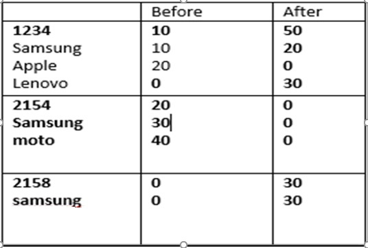 [ [ { id: '1234', before: '10', after: '50' }, { name: 'samsung', before: '10', after: '20' }, { name: 'Apple', before: '20', after: 0 }, { name: 'Lenovo', before: 0, after: '30' } ], [ { id: '2154', before: '20', after: 0 }, { name: 'samsung', before: '30', after: 0 }, { name: 'Moto', before: '40', after: 0 } ], [ { id: '2158', before: 0, after: '40' }, { name: 'samsung', before: 0, after: '30' } ] ]