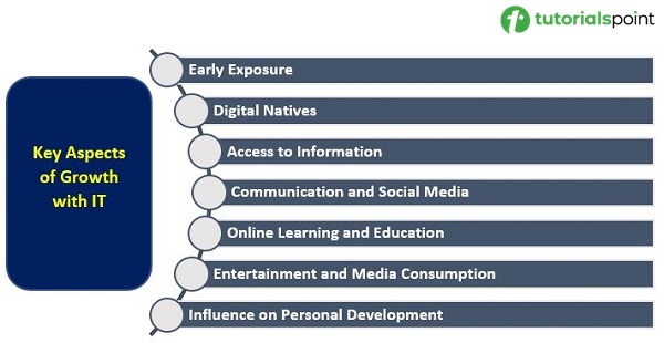 對個人發展的影響 - 個人成長受到與資料科技一起成長的極大影響。它培養了數字素養、批判性思維、解決問題的能力和適應創新的能力。人們獲得了數字時代的技能和知識,為軟體、網路安全、數字營銷和資料分析等行業打開了新的職業機會。此外,早期接觸科技可以提高認知能力、想象力和多工處理能力。然而,它也帶來了一些問題,例如資訊過載、網路安全和數字成癮,這需要培養韌性、自我調節和數字公民意識。與資訊科技一起成長透過為個人提供在數字時代取得成功所需的工具和能力來影響人類發展。
