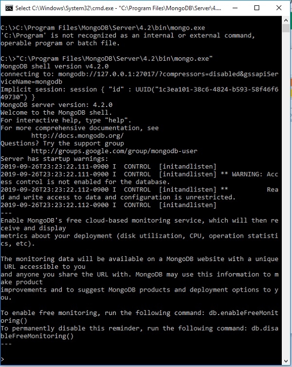 我們可以透過執行 MongoDB 服務來驗證安裝。在下面的螢幕中,我們使用位於程式檔案下的 mongo.exe 命令。作為響應,我們看到 MongoDB 伺服器正在執行。