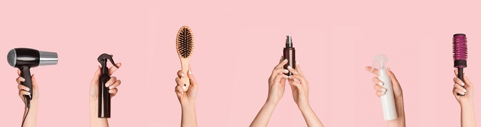 美髮產品,如髮膠、摩絲、髮蠟和噴霧,用於固定頭髮、創造紋理並增加光澤。美髮工具,如吹風機、直髮器和捲髮器、熱卷棒、刷子、梳子、夾子、髮夾和髮帶,用於吹乾、拉直、捲曲和將頭髮造型成各種髮型。