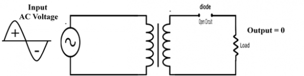 在負半週期期間,二極體的 P 端連線到負電源,這會反向偏置二極體,二極體表現為開路,並且不會在負載兩端產生輸出。