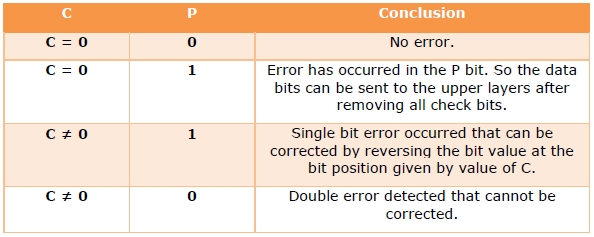 計算奇偶校驗位二進位制值的十進位制等價物。如果為 0,則沒有錯誤。否則,十進位制值給出出現錯誤的位位置。例如,如果 *c1c2c3c4* = 1001,則表示位置 9(1001 的十進位制等價物)處的數位有錯誤。該位被翻轉(從 0 變為 1 或從 1 變為 0)以獲得正確的訊息。