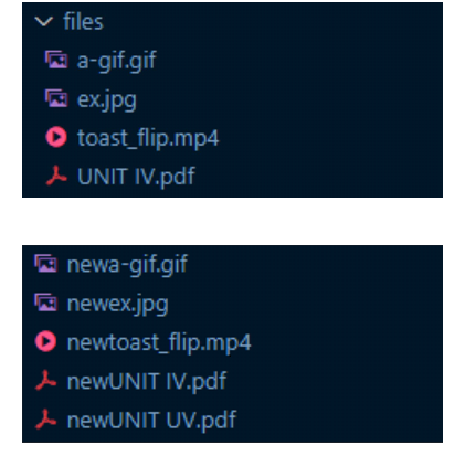 1 toast_flip.mp4 [Binary Data] row Inserted Successfully 2 ex.jpg [Binary Data] row Inserted Successfully 3 a-gif.gif [Binary Data] row Inserted Successfully 4 UNIT IV.pdf [Binary Data] row Inserted Successfully 1 toast_flip.mp4 BLOB Data is saved in Current Directory 2 ex.jpg BLOB Data is saved in Current Directory 3 a-gif.gif BLOB Data is saved in Current Directory 4 UNIT UV.pdf BLOB Data is saved in Current Directory