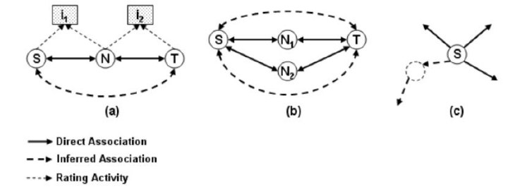 例如,如果使用者S和N對I1相關聯,並且使用者N和T對I2進行了評分,為了找到S和T之間的關係,我們可以使用透過使用者N的信任路徑,因為N是S和T之間的共同連結。