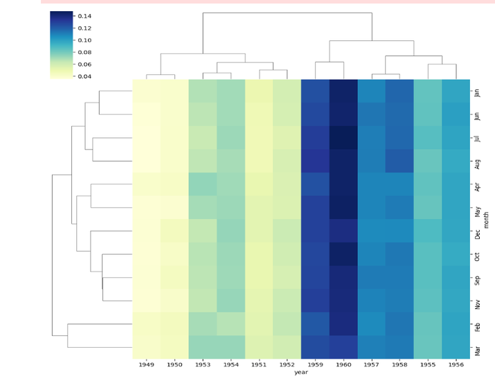 import seaborn as sns import pandas as pd import matplotlib.pyplot as plt # Load the inbuilt dataset data = sns.load_dataset("flights") # Data preprocessing data_pivot = data.pivot("month", "year", "passengers") # Data analysis monthly_totals = data.groupby("month")["passengers"].sum() yearly_totals = data.groupby("year")["passengers"].sum() # Data processing processed_data = data_pivot.div(monthly_totals, axis=0) # Create the clustered heatmap using seaborn clustermap sns.clustermap(processed_data, cmap="YlGnBu") # Display the heatmap plt.show()