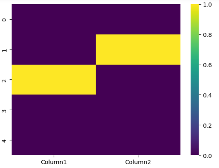 import pandas as pd # Creating a sample DataFrame data = {'Column1': [1, 2, None, 4, 5], 'Column2': [6, None, 8, 9, 10]} df = pd.DataFrame(data) import matplotlib.pyplot as plt import seaborn as sns # Creating a heatmap of missing values sns.heatmap(df.isna(), cmap='viridis') plt.show()