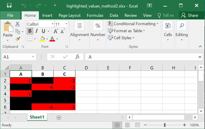 import pandas as pd import numpy as np # Method 1: Using Styler and Styler.applymap() def highlight_values(x): if x < 0: return 'color: red' else: return 'color: black' # Method 2: Using Styler and Styler.background_gradient() def gradient_color(data): norm = abs(data.values).max() return ['background-color: {0}'.format('red' if x < 0 else 'black') for x in data] # Method 3: Using numpy.where() def where_color(df): return np.where(df < 0, 'color: red', 'color: black') # Create a sample DataFrame data = {'A': [-2, 4, -1, 5, 0], 'B': [3, -6, 2, 7, -4], 'C': [-3, -2, 1, 6, -5]} df = pd.DataFrame(data) # Method 1: Using Styler and Styler.applymap() styled_df = df.style.applymap(highlight_values) styled_df.to_excel('highlighted_values_method1.xlsx', engine='openpyxl', index=False) # Method 2: Using Styler and Styler.background_gradient() styled_df = df.style.apply(gradient_color) styled_df.to_excel('highlighted_values_method2.xlsx', engine='openpyxl', index=False) # Method 3: Using numpy.where() styled_df = df.style.apply(where_color) styled_df.to_excel('highlighted_values_method3.xlsx', engine='openpyxl', index=False)