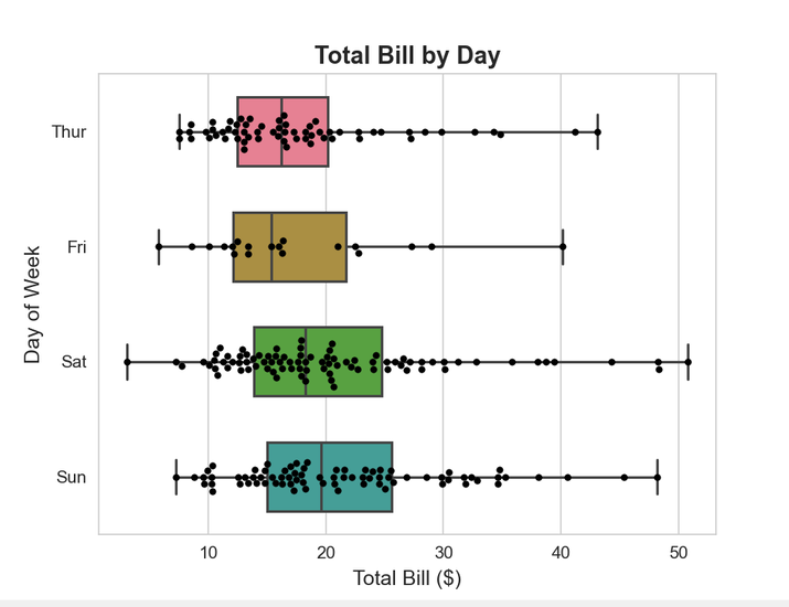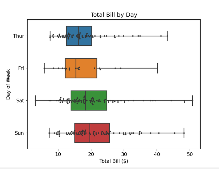 我們將 x 和 y 變數分別設定為“total_bill”和“day”,以便在 x 軸上繪製總賬單金額,在 y 軸上繪製一週中的日期。