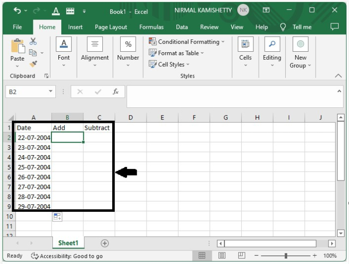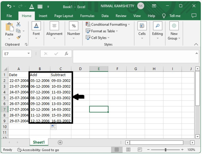 在這裡,我們將首先使用公式獲取第一個結果,然後使用自動填充柄完成任務。讓我們看看一個簡單的過程,在 Excel 中從日期列表中新增或減去給定的時間。