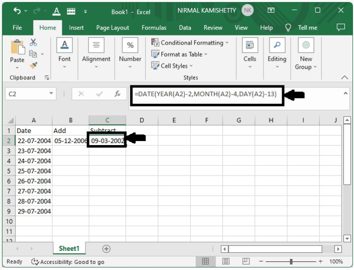 在我們的例子中,要新增或減去 2 年 4 個月 13 天,公式將是 -