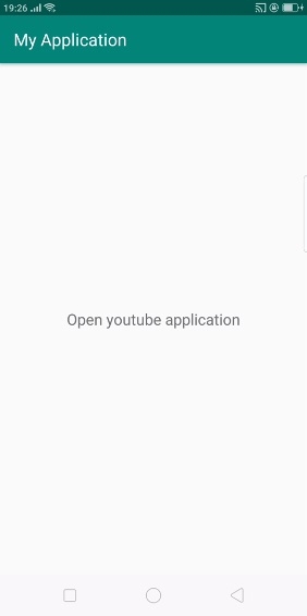 <?xml version="1.0" encoding="utf-8"?> <LinearLayout xmlns:android="http://schemas.android.com/apk/res/android" android:id="@+id/parent" xmlns:tools="http://schemas.android.com/tools" android:layout_width="match_parent" android:layout_height="match_parent" tools:context=".MainActivity" android:gravity="center" android:orientation="vertical"> <TextView android:id="@+id/openYoutube" android:text="Open youtube application" android:textSize="20sp" android:layout_width="wrap_content" android:layout_height="wrap_content" /> </LinearLayout>