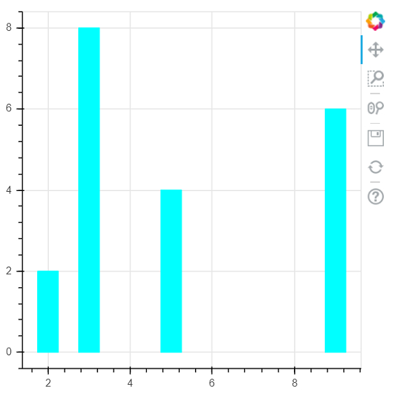 from bokeh.plotting import figure, output_file, show fig = figure(plot_width = 400, plot_height = 400) fig.vbar(x = [2,5,9,3], width = 0.5, bottom = 0, top = [2,4,6,8], color = "Cyan") output_file('barplot.html') show(fig)