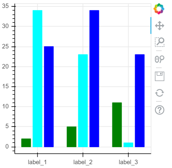 from bokeh.plotting import figure, output_file, show from bokeh.transform import dodge labs = ['label_1', 'label_2', 'label_3'] vals = ['val_1','val_2','val_3'] my_data = {'labs':labs, 'val_1':[2,5,11], 'val_2':[34,23,1], 'val_3':[25, 34, 23] } fig = figure(x_range = labs, plot_width = 300, plot_height = 300) fig.vbar(x = dodge('labs', -0.25, range = fig.x_range), top = 'val_1', width = 0.2,source = my_data, color = "green") fig.vbar(x = dodge('labs', 0.0, range = fig.x_range), top = 'val_2', width = 0.2, source = my_data,color = "cyan") fig.vbar(x = dodge('labs', 0.25, range = fig.x_range), top = 'val_3', width = 0.2,source = my_data,color = "blue") show(fig)