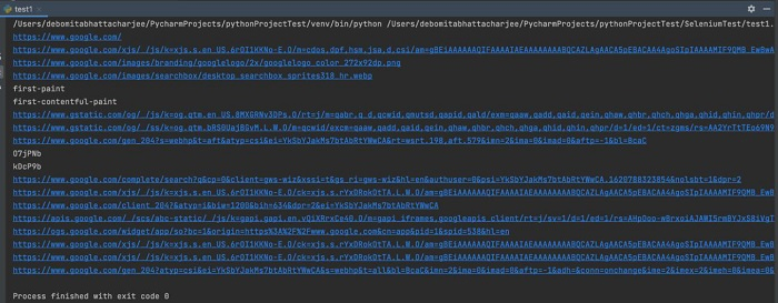 from selenium import webdriver #configure chromedriver path driver = webdriver.Chrome(executable_path='../drivers/chromedriver') #implicit wait driver.implicitly_wait(0.5) #url launch driver.get("https://www.google.com/") #JavaScript command to traffic r = driver.execute_script("return window.performance.getEntries();") for res in r: print(res['name']) #browser close driver.close()