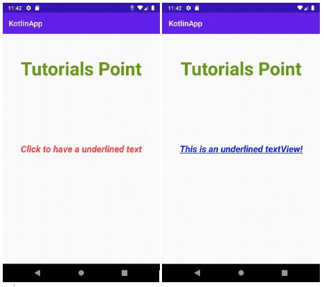 <?xml version="1.0" encoding="utf-8"?> <RelativeLayout xmlns:android="http://schemas.android.com/apk/res/android" xmlns:tools="http://schemas.android.com/tools" android:layout_width="match_parent" android:layout_height="match_parent" tools:context=".MainActivity"> <TextView android:layout_width="wrap_content" android:layout_height="wrap_content" android:layout_centerHorizontal="true" android:layout_marginTop="50dp" android:padding="8dp" android:text="Tutorials Point" android:textColor="@android:color/holo_green_dark" android:textSize="48sp" android:textStyle="bold" /> <TextView android:id="@+id/textView" android:layout_width="wrap_content" android:layout_height="wrap_content" android:layout_centerInParent="true" android:clickable="true" android:focusable="true" android:text="Click to have a underlined text" android:textColor="@android:color/holo_red_light" android:textSize="24sp" android:textStyle="bold|italic" /> </RelativeLayout>
