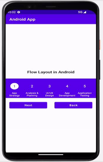 說明:在上面的程式碼中,我們建立了一個根佈局作為相對佈局。在此佈局內,我們建立了一個文字檢視,用於顯示應用程式的標題。之後,我們建立了一個StepView,我們將使用它以流程的形式顯示構建Android應用程式的步驟。之後,我們建立了一個水平線性佈局。在此線性佈局內,我們將建立兩個按鈕:下一步按鈕和後退按鈕。點選“下一步”將轉到下一步,點選“後退”將返回上一步。