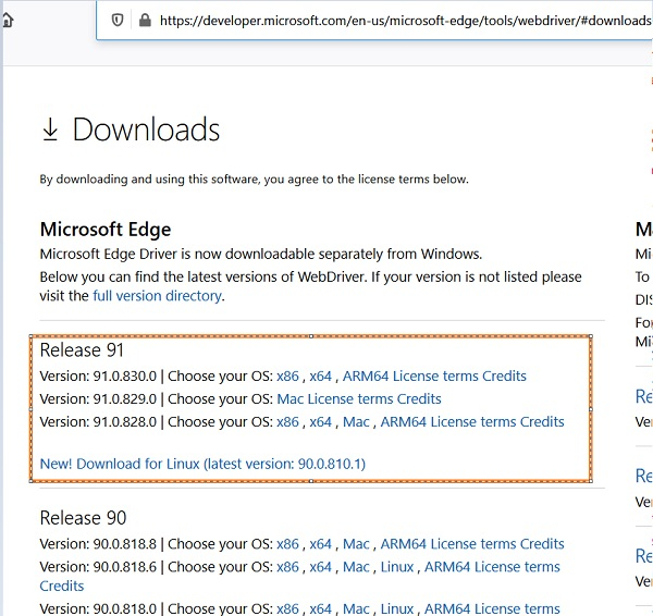 要下載 msedgedriver.exe 檔案,我們必須首先導航到以下連結:https://developer.microsoft.com/en-us/microsoftedge/tools/webdriver/#downloads