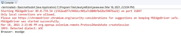 我們必須使用 System.setProperty 方法以及建立 EdgeDriver 類的物件來配置 msedgedriver.exe 檔案的路徑。